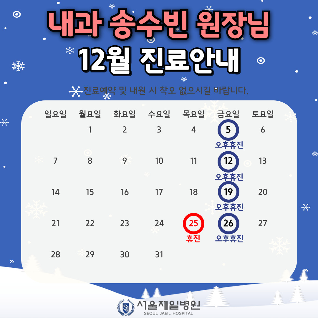 - 진료과 사정에 의하여 진료시간은 변동 및 조기 접수 마감 될 수 있으니 양해바랍니다.