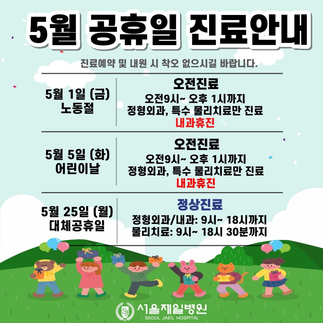 - 대체공휴일은 평일 진료시간과 동일합니다.